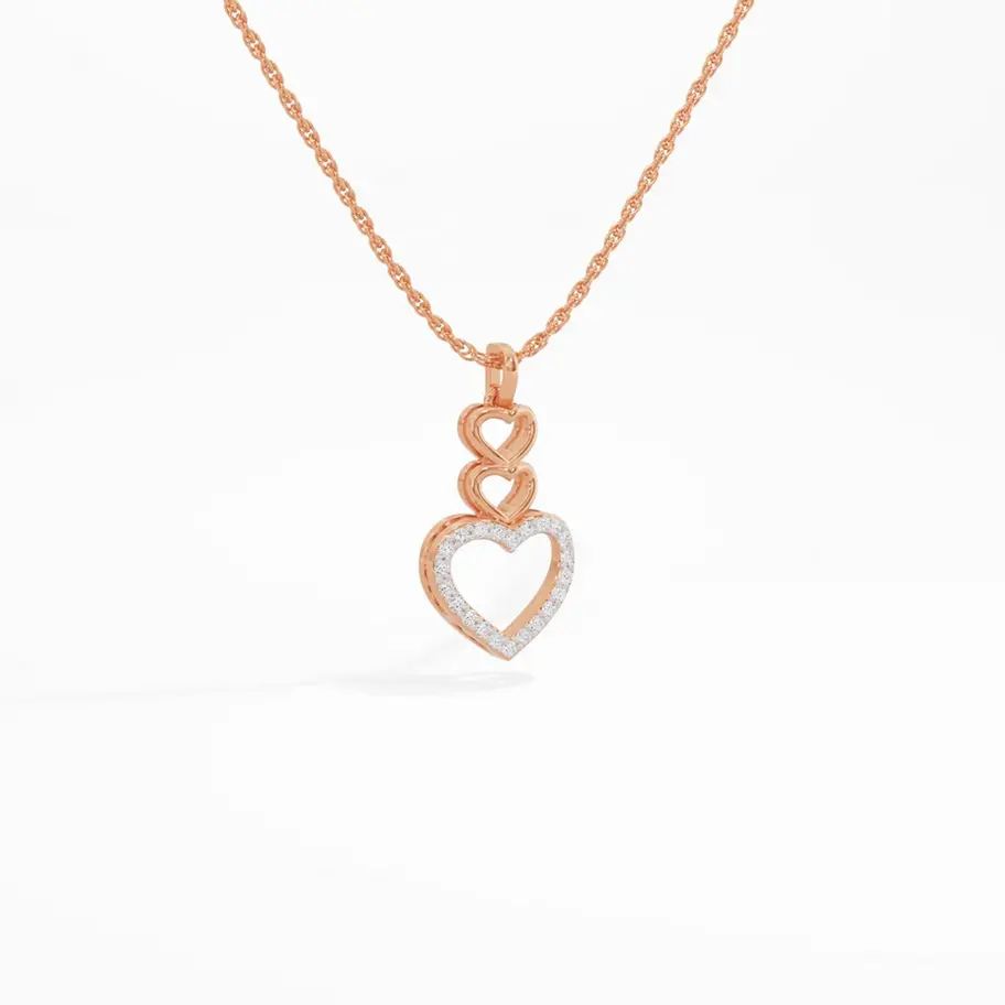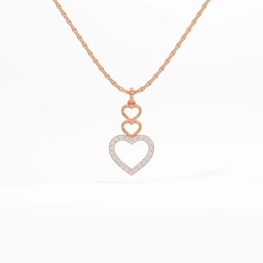 This elegant pendant features a graceful stacking of heart shapes, each layer capturing light with meticulously set stones. Crafted in sterling silver with optional rose gold plating and finished with rhodium to resist tarnish, it’s designed for comfort and timeless beauty. With an adjustable 16” + 2” chain, it fits seamlessly into any wardrobe—offering versatile elegance from daywear to evening ensembles.